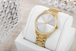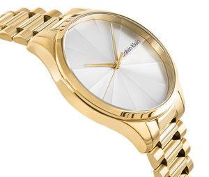UrWrist prezentuje zegarek damski CALVIN KLEIN Burst 25200232. Ten wyjątkowy zegarek nie tylko odmierza czas, ale czyni go piękniejszym. Jego subtelną tarczę zdobi promienisty szlif, który gra światłem przy każdym ruchu nadgarstka. Złote wskazówki i smukłe indeksy komponują się z idealnie wyważoną kopertą, tworząc harmonijną całość – pełną elegancji. Szeroka, połyskująca bransoleta dodaje charakteru i sprawia, że zegarek staje się biżuterią. To zegarek dla kobiet, które lubią błyszczeć – z klasą, ale z efektem „wow”, który zostaje w pamięci. Zegarek o średnicy 35 mm to idealne połączenie nowoczesnej elegancji i wyrazistego charakteru. Nieco większy rozmiar delikatnie zaznacza obecność na nadgarstku, podkreślając pewność siebie i styl właścicielki – bez przesady, z klasą. To doskonały wybór dla kobiet, które cenią subtelność, ale nie boją się zaakcentować swojej indywidualności i nowoczesnego wyczucia mody. Odkryj perfekcyjną harmonię detali i kobiecą elegancję z zegarkiem CALVIN KLEIN Burst 25200232.