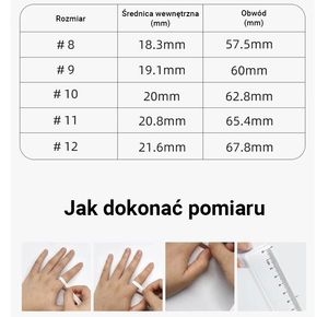 Rozmiar: 9 (US) – średnica wewnętrzna 19,1 mm, obwód 60 mm, grubość 2,9 mm